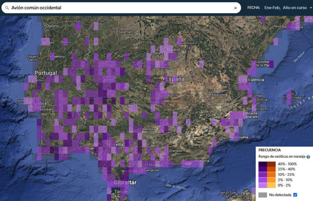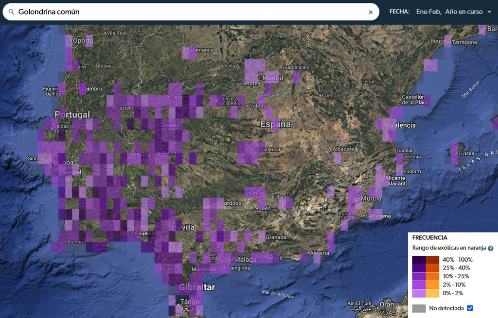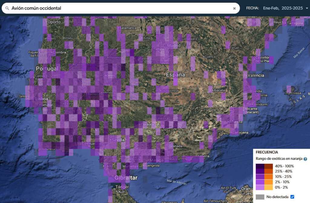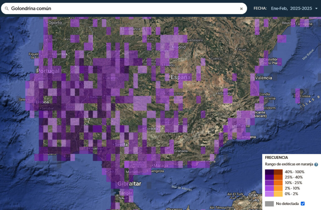 Si comparamos con las observaciones del mismo periodo del año pasado (2025), vemos que entre el 1 de enero y el 15 de febrero —periodo del río atmosférico— la distribución y frecuencia de observaciones era mucho más amplia (colores morados más intensos) e incluso llegaba a zonas más al norte. Este año (2026), en cambio, su distribución y frecuencia son mucho más bajas, y las aves no alcanzan las mismas latitudes al norte de la península.